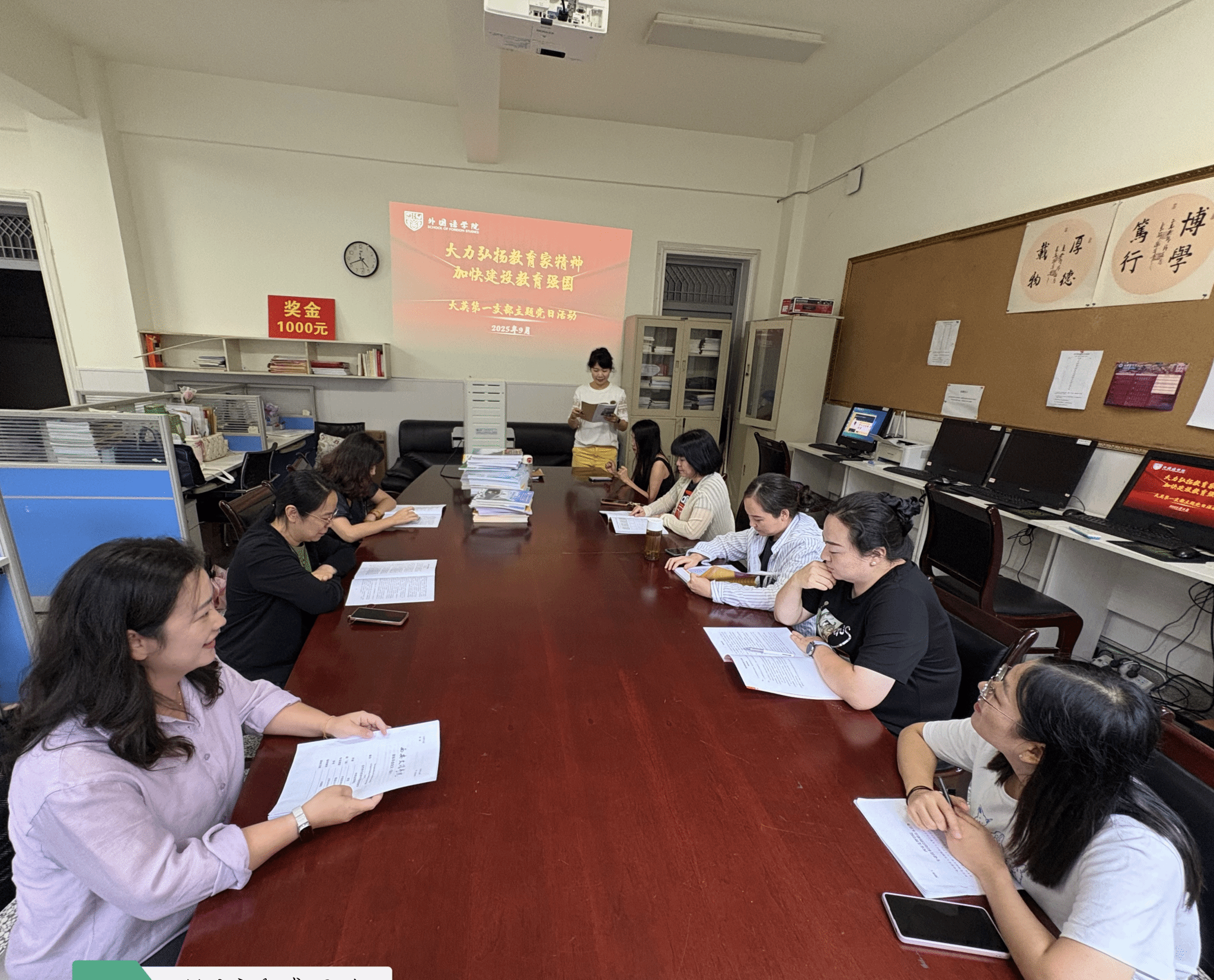 在第 41 个教师节来临之际,为深入学习贯彻习近平总书记关于教育家精神的重要论述,充分发挥党员教师的先锋模范作用,9 月 8 日下午,大学英语第一党支部以 “庆祝教师节、向榜样学习”为契机,组织全体党员开展 “大力弘扬教育家精神 加快建设教育强国” 主题党日活动,通过理论学习、榜样感悟、实践研讨等形式,凝聚育人初心,激发奋进力量。