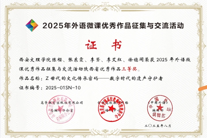 近日,由高等教育出版社、全国高校教师网络培训中心与《中国外语》编辑部联合主办的2025 年外语微课优秀作品征集与交流活动省级评审结果公布,外国语学院陈樱、张东霞、李赟、李艾红、徐镱闻组成的教师团队表现亮眼,其作品《Z 世代的文化传承密码— 数字时代的遗产守护者》荣获陕西省优秀作品三等奖。