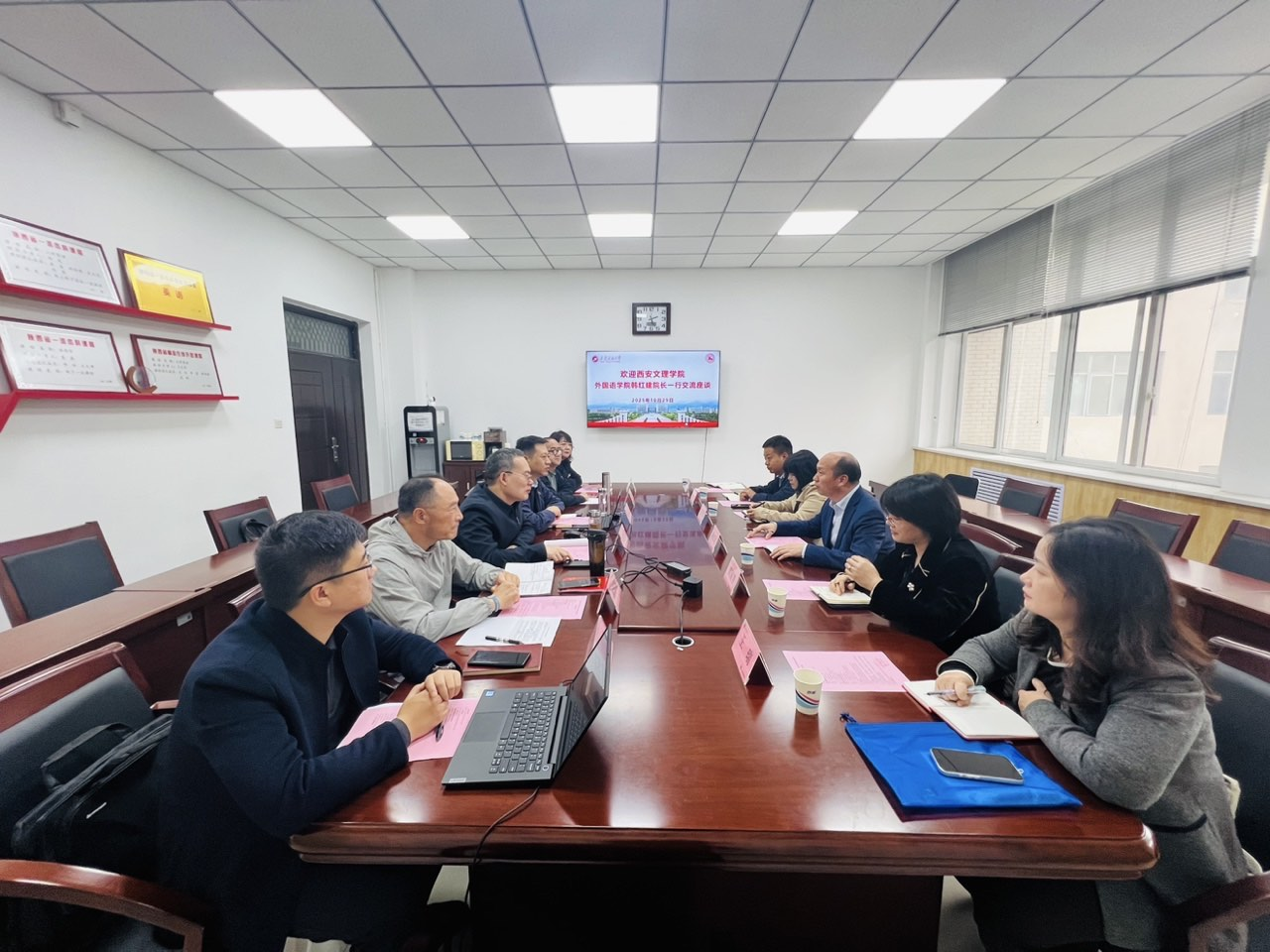 10月29日,为深入落实学校“七个五”工作举措,加强高校之间交流与合作,推动外语专业学科建设及大学英语教学改革,外国语学院院长韩红建、副院长熊国芳、张东霞及系部主任一行六人赴西安石油大学外国语学院开展调研交流。西安石油大学外国语学院党委书记张建高、副院长陈武及各系部负责人参与调研交流。