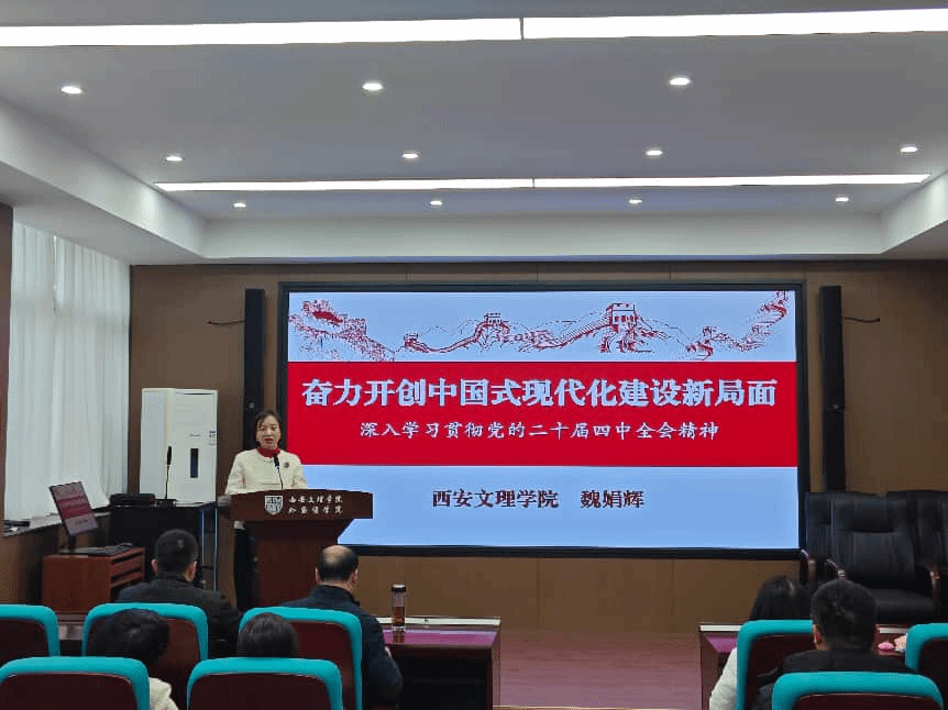 12月10日,外国语学院召开全体教工大会,专题学习党的二十届四中全会精神。本次专题学习特邀学校二十届四中全会宣讲团成员、马克思主义学院魏娟辉副教授作题为《奋力开创中国现代化建设新局面 深入学习贯彻党的二十届四中全会精神》的宣讲报告。